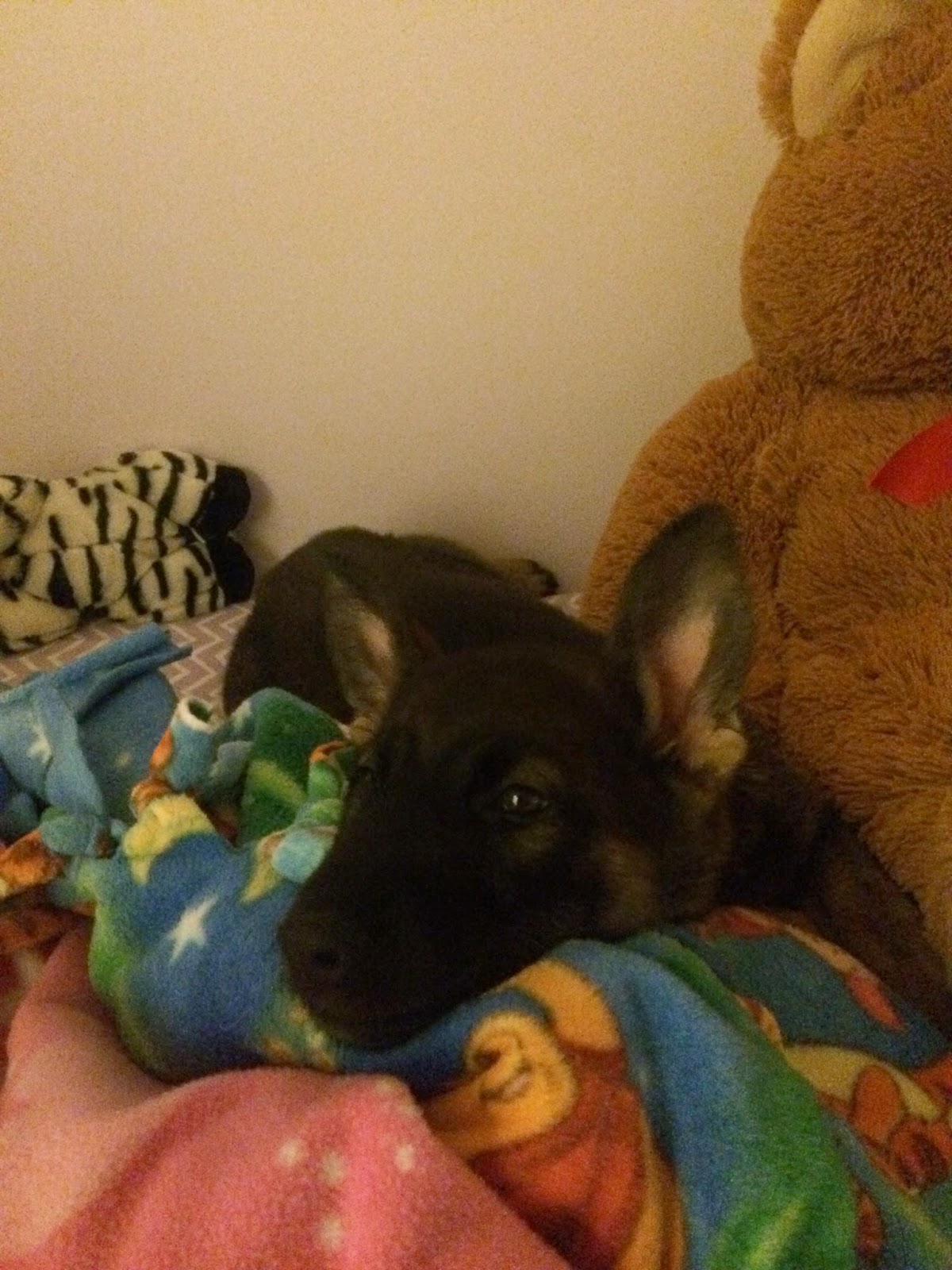 As of November, our German Pepper Ariel got her first round of shots, her ears perked up for the first time, and she began to figure out the wonders of sneaking into Jocelyn's bed.